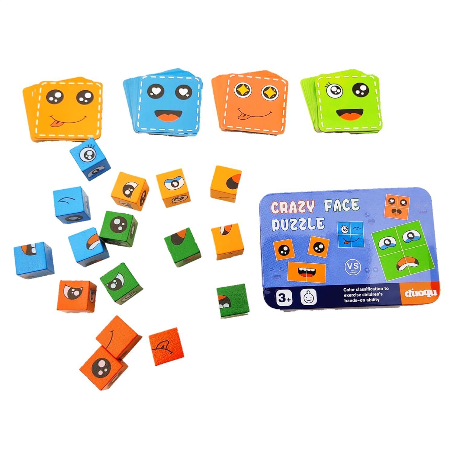 Wooden cube puzzle with changing facial expressions and matching cards, designed to enhance emotional recognition and cognitive skills.